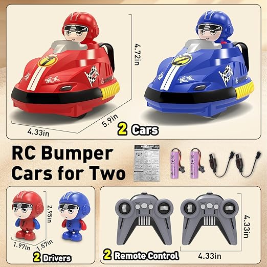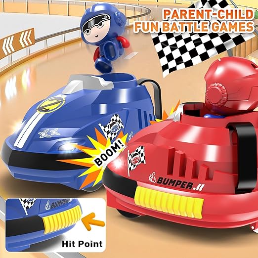 - 🚗【2PK RC BUMPER CARS】The toddler remote control car comes in a pack of 2 pieces, which can be shared with friends. It is an excellent toy for young children to develop social skills, logical thinking, and direction while enjoying the fun of competitions. The RC boy bumper car toy includes 2 cartoon racing cars, 2 detachable characters, 2 remote controls, and 1 instruction. Perfect for children aged 4-10 and above, helping adults cultivate parent-child relationships.